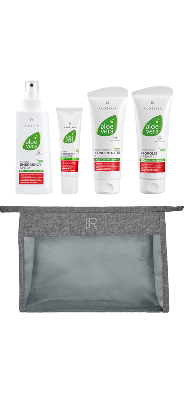 Vier Aloe Vera Pflegespezialisten in der praktischen Care Bag. Aloe Vera-Gel: -> Aloe Vera Moisturising -> Concentrated Gel, 100 ml -> Aloe Vera Protecting Propolis Cream, 100 ml -> Aloe Vera Instant Emergeny Spray, 150 ml -> Aloe Vera Instant Emergency Cream Gel, 30 ml